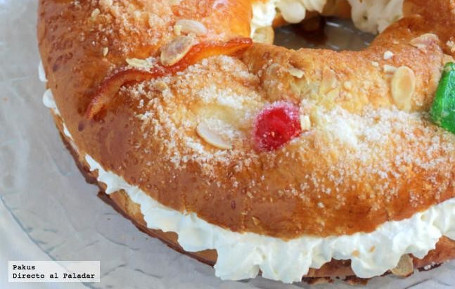 Horneamos con calor tanto en bóveda como en solera a unos 230º, y sacamos cuando cada roscón tenga un bonito color, tras unos 14-16 minutos de cocción. Recordad que cada horno tiene sus tiempos, es mejor guiarse por la experiencia. Dejamos enfriar los roscones, y si queremos hacer uno relleno, lo cortamos por la mitad con un cuchillo de sierra y lo rellenamos con pegotitos de nata montada